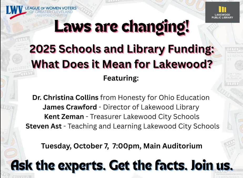 If you're wondering how new state and federal laws are affecting education and libraries in Lakewood, you're not alone. Our community forum features keynote speaker, Dr. Christina Collins, who leads Honesty for Ohio Education, a grassroots nonprofit group dedicated to promoting understanding of public education policy and civic issues. Dr. Collins will be joined by James Crawford, Director, Lakewood Public Library, as well as Lakewood City Schools Treasurer Kent Zeman and Director of Teaching and Learning Steven Ast. Bring your curiosity and your questions for audience Q&A time. This event is presented by League of Women Voters of Lakewood in collaboration with Lakewood Public Library.